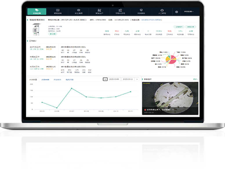 云平臺或APP上實時查看設備分布點位、工作狀態、電池電量等,進行功能設置等設備管理操作;可視化顯示害蟲圖片、種類數量、變化趨勢,智能分析蟲情報告,基于農業知識圖譜推薦蟲害防治方法。